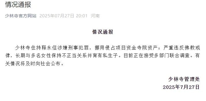 少林寺住持释永信涉嫌刑事犯罪,挪用侵占项目资金寺院资产;严重违反佛教戒律,长期与多名女性保持不正当关系并育有私生子。目前正在接受多部门联合调查。有关情况将及时向社会公布。